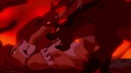 Gdy Simba wraca i dochodzi do walki, hieny stoją po stronie Skazy przeciwko lwicom i Simbie. Jednak kiedy podczas ostatecznego pojedynku Skaza mówi bratankowi, że to hieny namówiły go do zabicia Mufasy, te tracą do niego resztki zaufania. Po zrzuceniu go ze skały przez Simbę, otaczają go z żądzą zemsty. Lew jeszcze próbuje błagać o życie, lecz rozwścieczone i podsycane przez głód hieny rzucają się na swojego przywódcę i rozszarpują go żywcem, wśród płomieni otaczających Lwią Skałę.